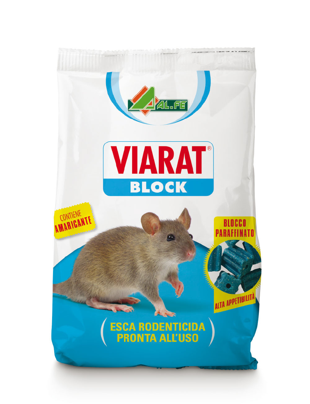 VIARAT BLOCK è un’esca rodenticida, pronta all’uso, a base di una sostanza attiva anticoagulante nota come Brodifacoum, efficace contro Topolino domestico (Mus musculus), Ratto grigio (Rattus norvegicus), anche dopo una singola ingestione.