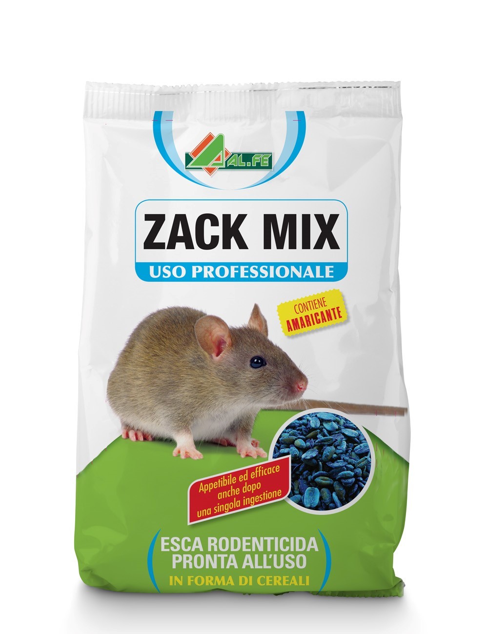 ZACK MIX è un’esca rodenticida, pronta all’uso, a base di una sostanza attiva anticoagulante (Difenacoum), efficace contro Topolino domestico (Mus musculus), Ratto grigio (Rattus norvegicus) e Ratto nero (Rattus rattus).