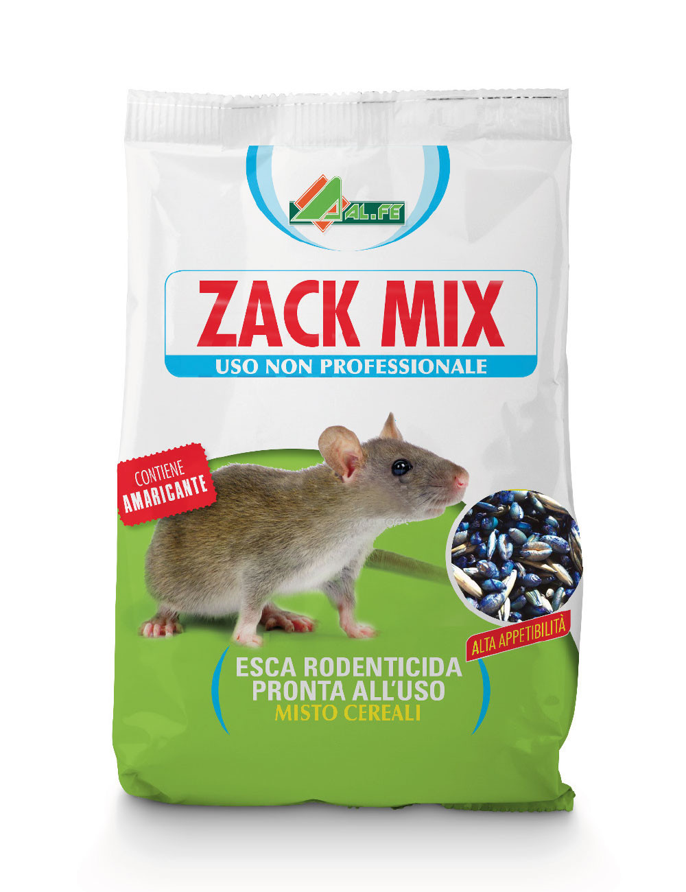 ZACK MIX è un’esca rodenticida, pronta all’uso, a base di una sostanza attiva anticoagulante, nota come Brodifacoum, efficace contro Topolino domestico (Mus musculus), Ratto grigio (Rattus norvegicus), anche dopo una singola ingestione.